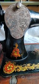 in ferro, ghisa e legno decorata originale, utilizzata sino al 2004 completa di copertura e aghi Singer qualche punto di usura del coperchio, ma aderente alla base con ganci come da acquisto.