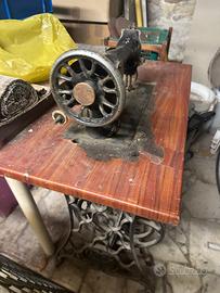 Singer a pedale antica, un oggetto da collezione XIX o all'inizio del XX secolo. Include una base in ghisa lavorata e un piano di lavoro in legno.