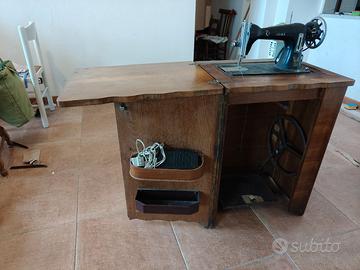 Macchina da cucire anni '70 - '80 della VEMAC. Il corpo macchina è in ghisa ed il sistema di trasmissione è sia manuale che con pedale comandato elettricamente. Il mobiletto in legno si presenta in più che buono stato di conservazione. Sono escluse le spese di spedizione. Sì predilige il ritiro in presenza. Ci scusiamo se al momento degli scatti fotografici, la macchina non è stata sottoposta ad alcun trattamento di pulizia.