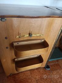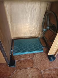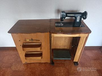 Macchina per cucire a pedale anni '70-'80. Ha diversi segni di usura ma complessivamente è in buone condizioni e funziona (l'ago si muove alla pressione del pedale). Con manuale e accessori originali.