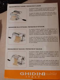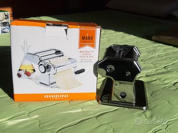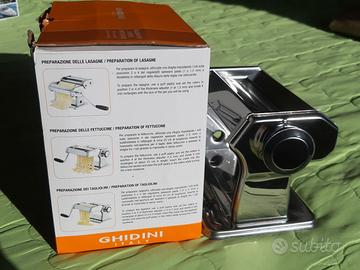 Vendesi macchina Ghidini per la pasta fresca manuale fatta in casa: sfoglia. Tagliatelle, spaghetti … Nuova e mai usata ancora in confezione originale. Corpo in acciaio inox con rulli in alluminio per purezza, con maniglia e morsetto, colore argento. Dettagli nelle foto allegate. Contattatemi per appuntamento e per visionare la macchina.