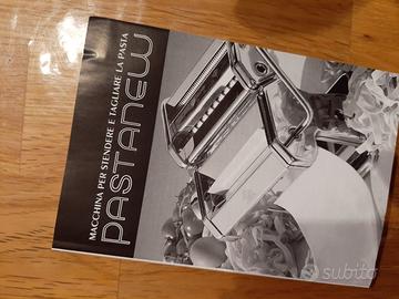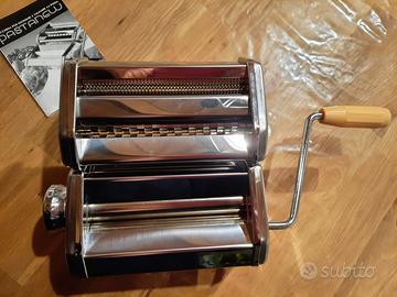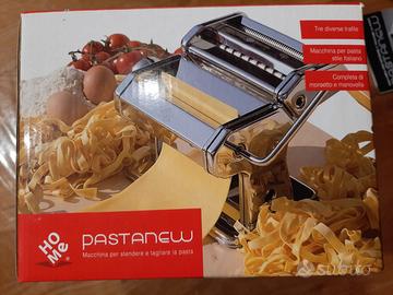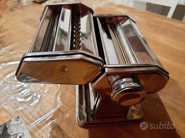 Macchina in acciaio per stendere e tagliare la pasta, completa di manovella e morsetto, ancora in confezione originale, mai usata. Macchina a 3 trafile per fare in casa pasta fresca in diversi formati.