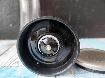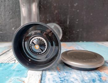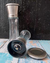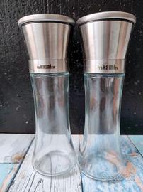 Due macinini manuali per pepe, sale e spezie varie. Corpo in vetro trasparente e grana regolabile e parte superiore in acciaio inossidabile argentato. Usato un paio di volte. Altezza 192 mm Larghezza 65mm