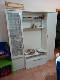Madia 160x195 cm con due ante laterali (di cui una a vetro con cassettone inferiore) e parte centrale con ripiani alti e con cassettone centrale nella parte inferiore. ottimo stato. Ripiani interni. utilizzata solo poche settimane nel periodo estivo. Colore bianco latte