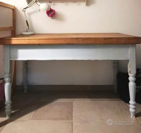 Antica madia con piano in legno naturale e piedi color carta da zucchero. Piccolo difetto ad un piede che non dà problemi. Molto capiente la parte interna.
