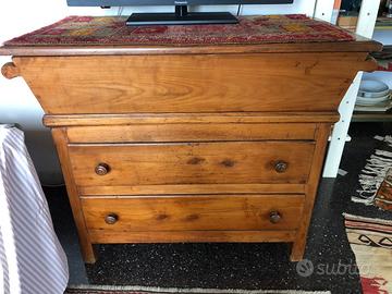 Vendo cassettone antico in legno massello noce chiaro caratterizzato da una particolare ribalta/asse superiore apribile, tipica dei mobili rustici dell’Ottocento impiegati come cassoni guardaroba o madie contenitore.