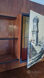 Madia bar-libreria anni '50. Modernariato vintage italiano in legno impiallacciato con libreria a giorno. Nella parte centrale un'antina in marmo con foto del "trofeo Fuentes" alla Darsena di Luigi Sacchi (1845) nasconde uno scomparto bar specchiato.