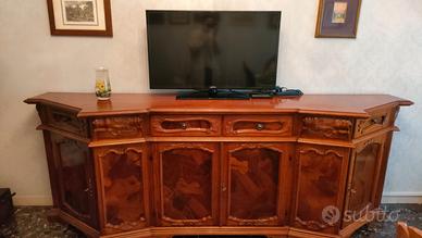 Madia in legno con 4 cassetti superiori e 4 ante inferiori. Pannelli in legno decorato e in rilievo. Chiusura con chiavi originali.
