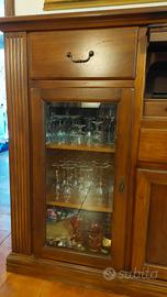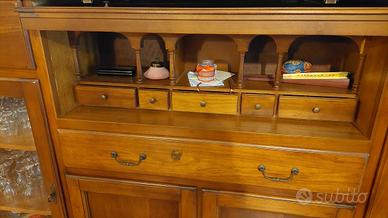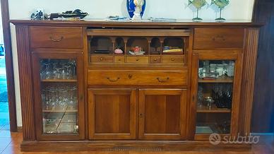 Il mobile è composto da 2 cassetti molto capienti alle estremità, sotto di essi 2 vetrine da 3 scomparti ciascuna, un cassetto grande nella parte centrale, sopra al cassetto uno spazio coperto contenente 5 piccoli cassetti mentre nella parte di sotto 2 grandi ante con 2 scomparti.