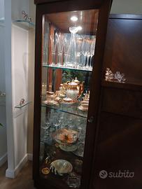 Madia classica a mezzaluna realizzata con legni pregiati. Struttura: 3 cassetti, 1 scomparto con doppia anta e 1 scomparto con anta singola entrambi provvisti di chiavi, 2 vetrinette laterali con faretti. Marca Carpanelli.