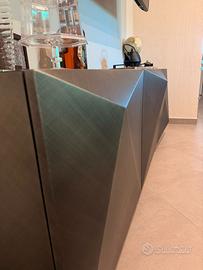 Questa madia si distingue per le sue ante tridimensionali con finitura diamantata, che creano giochi di luce e ombre, conferendo dinamismo e raffinatezza a qualsiasi ambiente.
