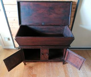 Madia compatta, credenza bassa (tipo panara/ panarina) a struttura trapezioidale, di metà /fine '800, manifattura artigianale, originale, in legno di castagno massello, a due ante con cornice e chiusura a perno girevole in legno, (fissaggio ad anelle in ferro battuto), con modanature decorative applicate, coperchio superiore che si apre a ribalta su un vano contenitore (cerniere a libro in ferro battuto). Piedi a profilo piramidale.