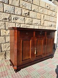Madia in legno, Credenza con 3 ante e 3 cassetti in arte povera. Il mobile non è troppo grande e puo essere collocato in qualsiasi punto della casa dal soggiorno all'ingresso alla cucina. Elegante madia in stile classico, chiave presente e serrature funzionanti. Buffet di una bella tonalità di legno di colore noce scuro si abbina perfettamente a tutti gli stili, dal classico al moderno. Credenza di forma lineare in ottime condizioni perché completamente restaurata. La credenza è molto spaziosa, con 1 ripiano grande per riporre qualsiasi oggetto. Maniglie ad anello in metallo e piedi a cipolla.