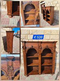 - Libreria con 2 archi in legno Massello, Credenza con vani a giorno e 6 ripiani. Elegante libreria in stile classico di una bella tonalità di legno di colore noce chiaro si abbina perfettamente a tutti gli stili, dal classico al moderno. Mobile di grande qualità riccamente intagliato e decorato con motivi floreali. Credenza di forma lineare in ottime condizioni perché completamente restaurata. Il mobile è molto spazioso, con dei ripiani grandi per riporre qualsiasi oggetto o grandi faldoni per uno Studio Professionale. La libreria puo essere collocato in qualsiasi punto della casa dal soggiorno all'ingresso o in uno studio. L. 140 P. 43 H. 153 € 520,00.