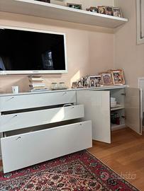 Credenza/Madia in laccato bianco ludido della MOLTENI, molto ben conservata, come fosse nuova, con 2 + 2 ante, 1 cassettone centrale ampio, 1 cassetto + 1 cassetto a ribalta. In aggiunta, 2 ripiani della lunghezza del mobile + 2 un pò più corti per dare un effetto discontinuo, da usare come libreria/sopramobile. Da vero amatore del genere dei mobili di firma. Si vende per cambio casa. le misure sono: 2,90 di lunghezza, 70 di altezza e 54 di profondità.