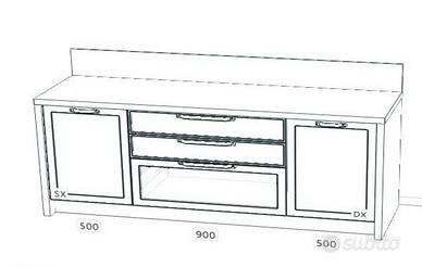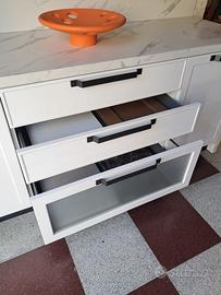 Mobile Cucina cm 199 x 61 H= 87 alzata H=20 cm . 2 basi da cm 50 una cassettiera con cestone Vetro cm 90 . Guide a estrazione totale BLUM . ideale come mobile cucina forando il piano si può mettere un piano cottura a gas o induzione. i 2 portali Dx e Sx la rendono importante assieme al Top 4 cm in laminato calacatta . mobile NUOVO da esposizione per rinnovo mostra da vedere da HOMICASA a SBT in via val cimarra 69 . il prezzo non comprende il Trasporto e il Montaggio da calcolare a parte .