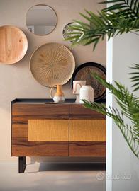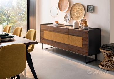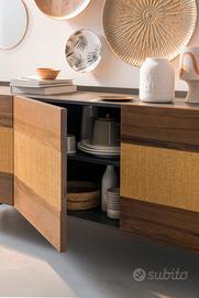 COSTO TRASPORTO DA CONCORDARE L 197 - P 50 - H 85 cm Madia a 3 ante in Cerro nodato cognac e texture intreccio con 3 ripiani, basamento in ferro verniciato nero, scocca in materico grigio. (disponibile su ordinazione anche in altre finiture e dimensioni).