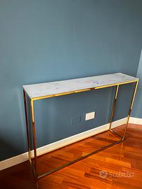 Piccola madia acquistaa circa due annibfa su westwing pagata non poco. Rifinita molto bene, prodotto di qualità e design. Struttura in metallo dorato lucido e ripiano in vetro fantasia marmo statuario.