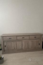 Madia e Vetrina modello Anthony, caratterizzate da due ante scorrevoli e tre cassetti, con disponibile in finiture in rovere.