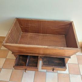 Madia in legno in condizioni discrete ma rimane comunque un bel pezzo d'arredamento, con due cassettini. L'interno è stato rivestito con della carta effetto legno Per ulteriori foto o informazioni non esitate a contattarmi!