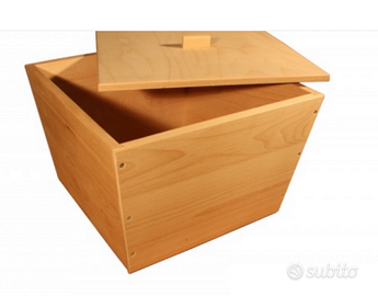 Contenitore quadrato con bordi svasati in faggio massiccio evaporato con un sistema tradizionale di doghe a incastro e successivo fissaggio della base e dei bordi con viti.
