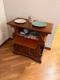 Piccola madia in noce massello, L=80, P=40, H=82, con sportello alto ribaltabile, 2 antine, e 2 spazi laterali a tasca.