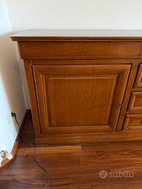 Il mobile è realizzato interamente in legno massello con finitura classica, caratterizzato dalla qualità artigianale tipica del Made in Italy di Le Fablier. Dispone di due ampie ante laterali con ripiani interni e tre cassetti centrali spaziosi, offrendo un'ottima capacità contenitiva.