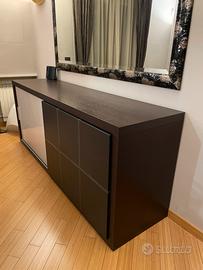 Madia moderna in wengé in ottime condizioni, ideale per soggiorni di grandi dimensioni. La madia e’ composta da 2 ante scorrevoli da 120 cm ciascuna, una in vetro color moka e l’altra rivestita in pelle color cacao con cuciture chiare in tinta con l’anta in vetro e binari in alluminio. Oggetto elegante e di ottima qualitá, molto capiente per tutte le vostre stoviglie o set di bicchieri, vendo causa trasloco. Disponibile Subito!