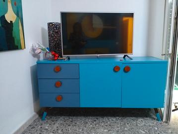 Madia di colore blu cobalto, che potrebbe anche esser verniciata di bianco, composta da tre cassetti capienti e due ante con un ripiano centrale. Dimensioni: ho 83 x lunghezza 160 x profondità 50. pezzo unico,