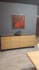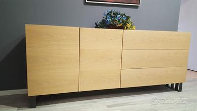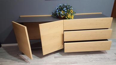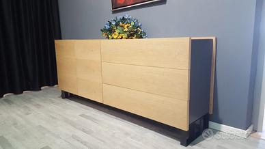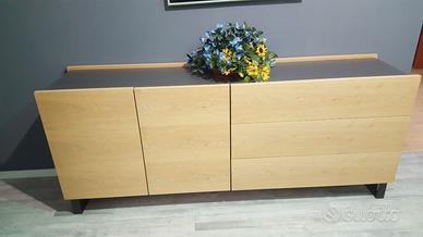 Madia composta da modulo 2 ante e modulo 3 cassetti. Struttura laccato basalto, frontali impiallacciati rovere. Basamento metallo h. 16.8 cm. Misure L. 204 P. 48.3 H. 72.1