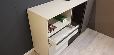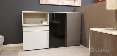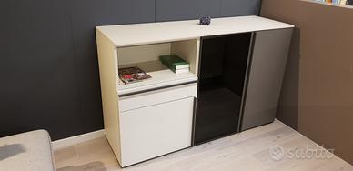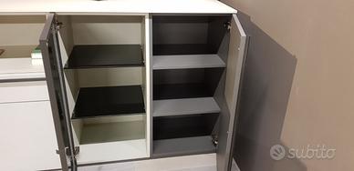 Madia in finitura laminato bianco opaco con anta in color tortora, anta vetro fumè, anta bassa con cassetto superiore e vano a giorno. Misure L. 160 P. 50 H. 100 cm