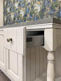COSTO TRASPORTO DA CONCORDARE Dimensioni: L. 166 cm H. 95 cm P. 60,5 cm La madia Opera sa interpretare lo stile delclassico provenzale, un eleganza mediterranea raccontata attraverso gli elementi decorativi. Le tonalità del legno gessato definiscono unostile senza tempoper creare atmosfere country accoglienti ed evocative. la base terminale a giorno con colonnine, diventa una possibile soluzione per sfruttare lo spazio in nome della praticità, ma anche dello stile. Maniglia pomolo goccia, ante in legno naturale bianco.