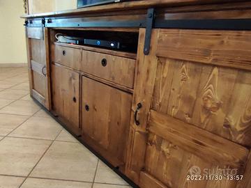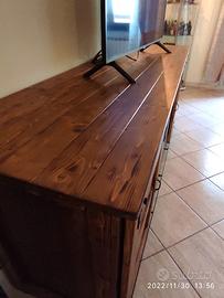 Madia in stile rustico di legno massello di Abete, costruito a mano . Stile rustico con 2 sportelli scorrevoli tipo fienile , 2 sportelli a scatto, 2 cassetti, vano porta accessori TV. Costruito su misura, trattato con impregnante noce antico e protettivo trasparente, colorazione giusta per evidenziare la natura del legno. Questo esempio in foto misura 200 x h 82 x prof. 55 misure a scelta del cliente, richiedi preventivo. Tempo di costruzione 20/25 giorni Il mobile viene costruito su richiesta ritiro ( spedizione da valutare)
