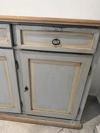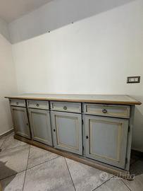 Credenza in stile shabby chic caratterizzata da linee classiche e finitura effetto decapato, ideale per ambienti rustici, country o contemporanei con richiami vintage. Il mobile presenta una struttura solida con top in legno naturale, quattro ante capienti e quattro cassetti superiori, perfetti per organizzare stoviglie, biancheria o oggetti vari. Le maniglie ad anello in metallo e i dettagli leggermente vissuti valorizzano il carattere autentico del pezzo. Soluzione versatile: può essere utilizzata in soggiorno, cucina, sala da pranzo oppure come elemento decorativo in ingresso o studio. ⸻ Caratteristiche principali •Stile: shabby chic / rustico •Colore: grigio chiaro con finitura effetto invecchiato •Top: legno naturale •Struttura: 4 ante + 4 cassetti •Ottima capienza e robustezza •Ideale sia per uso funzionale che decorativo Misure : L: 203. P: 42 H: 89