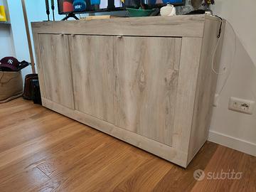 Madia soggiorno/mobile porta tv 160x42 cm per 85,5 cm d'altezza. 3 ante, molto capiente. Colore bianco/betulla sbiancata, effetto legno.