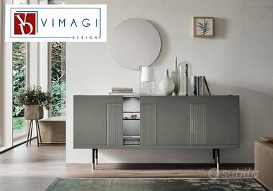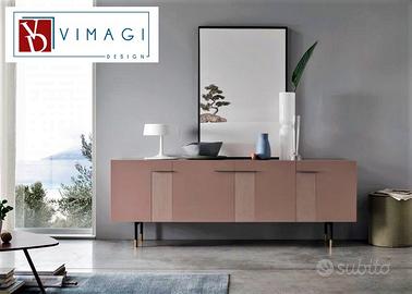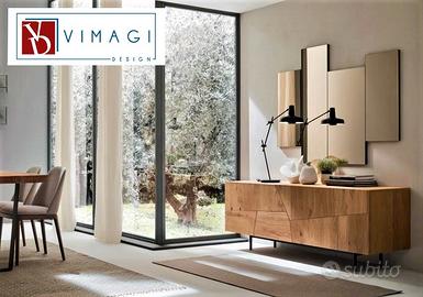 Il design crea sulla superficie della madia un disegno che attraversa il frontalee suddivide in modo originale i due cassetti