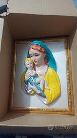 Madonna con bambino Gesù in braccio cm 40×43 creato da me in gesso alabastrino, da interni, rifinitura davanti e dietro, vernice trasparente protettiva davanti, dietro legno pino, modellato...