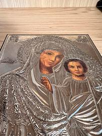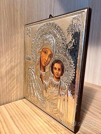 Icona sacra, Madonna con bambino, in legno e argento 925. Dimensioni 19x22
