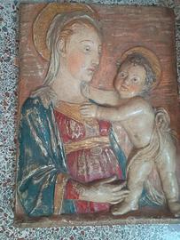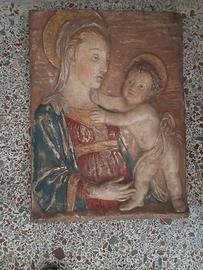 Altorilievo in terracotta raffigurante la Madonna con il Bambino in atteggiamento affettuoso e composto, secondo un modello rinascimentale ispirato alla bottega di Francesco di Simone Ferrucci o ai Della Robbia. La Madonna è rappresentata a mezzo busto, con manto blu e veste rossa decorata da motivi dorati. Il Bambino nudo è in posizione dinamica, con aureola incisa.