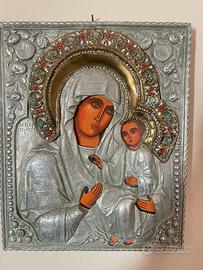 Si tratta di un icona Russa che raffigura la vergine Maria a mezzo busto con il volto reclinato verso il bambino Gesù. L icona è arricchita con riza in materiale argentato con dettagli dorati e smaltati È considerata la protrettrice celeste della russia e patrona del focolare domestico, frequentemente donata agli sposi durante le nozze. L’ icona risale al XIX secolo, (fine ‘800 inizi ‘900)