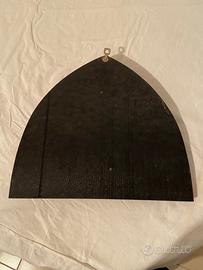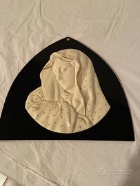 Madonna in ceramica su vetro nero. Base cm 39, altezza cm 35, spessore vetro cm 0,50; spessore massimo ceramica cm 5.