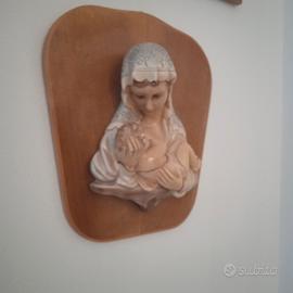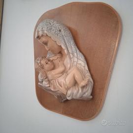 La figura in rilievo e' in ceramica policroma, mentre la base sagomata è in legno naturale.