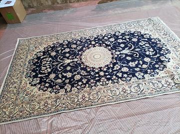 Il tappeto presenta un imponente medaglione centrale crema su un campo blu scuro/notte, circondato da una ricca decorazione floreale e da una bordura importante in tonalità chiare. Il contrasto tra il fondo profondo e i dettagli luminosi crea un impatto estetico di grande eleganza, mantenendo un perfetto equilibrio tra tradizione persiana e stile decorativo.