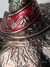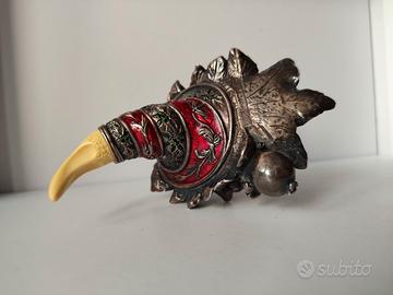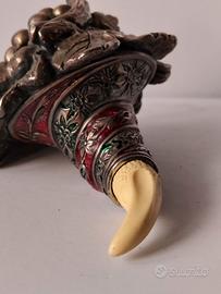 Cornucopia con avorio finale colorato prodotta da Magrino, un noto argentiere fiorentino. Materiali: Scultura realizzata in laminato argento 925 e resina colorata (che simula l'avorio), con dettagli smaltati. Utilizzo: Può essere utilizzata come fermacarte o decorazione. Significato: È considerata un amuleto che simboleggia prosperità e abbondanza. Dimensione: 12x8cm circa 25 grammi di argento 925 Condizioni ottime Spedizione curata e sicura