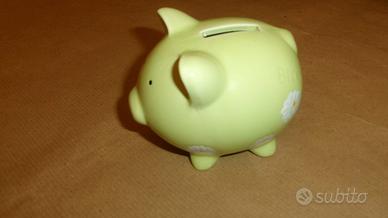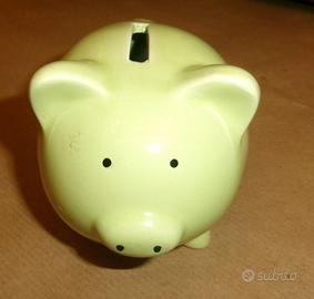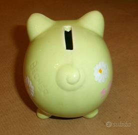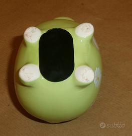 Grazioso maialino salvadanaio per bambini, in ceramica, colore verde chiaro, con decorazioni floreali e scritta rosa "Sal(umificio) Valpa. Misure: 9,5 cm. x 8,5 cm. x 8 cm. Misura della fessura per monete: 29 mm. x 4 mm. Nel sottopancia tappo di apertutura in plastica.