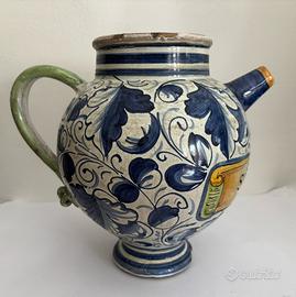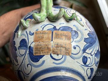 Versatoio di Montelupo, fine del XVI sec, altezza 22 cm , assenza di restauro, due piccole sbeccature sul labbro e alla base del manico, come riportato in foto. Il versatoio è passato negli anni ‘70 in asta da Sotheby’s Firenze. Visibile a Mantova o Vigevano, si può spedire tramite spedizione assicurata o si effettua consegna diretta in tutto il nord Italia o Sicilia . la richiesta è di 400 euro non trattabili.