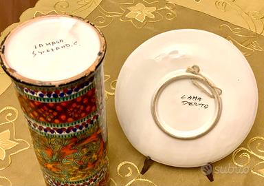 N.B.: PREZZO INDICATO PER CIASCUNO DEI DUE ARTICOLI. Maioliche artistiche vintage, veri pezzi da collezione, vendibili anche separatamente. 1°-3 PIATTI DERUTA con decoro Raffaellesco. Diam. cm. 21. €70 2°-VASO decoro "FUOCO DELL'ETNA", in ceramica LA MAGA di S. Stefano di Camastra. Diam. cm. 10 x H cm. 28. €70. PEZZI RARI in perfette condizioni. INFO: 351/3331804.