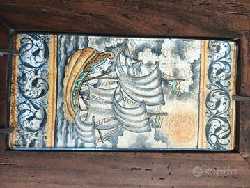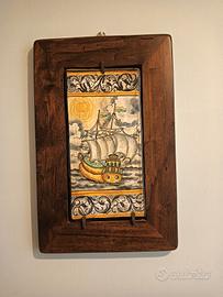 ceramica di castelli,velieri dipinti a mano SACA cm 13 per 28 circa , con cornice in legno massello cm 25 per 40 circa.