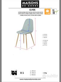 Vendo 4 sedie Maison du Monde modello Clyde in microfibra effetto anticato. Il prezzo esposto si riferisce a 4 sedie. Possibile vendita anche di singolo pezzo a 45€ per sedia. Con la sua base d'appoggio in acciaio imitazione legno e il suo rivestimento in microfibra effetto anticato, quest'originale sedia ravviverà con eleganza un ufficio classico o una sala da pranzo sobria. Comoda e robusta, questa sedia è dotata di un'imbottitura in schiuma ad alta densità per una seduta morbida e piacevole. Dimensioni e peso in foto 4. Sedie usate ma in condizioni ottime. Vendita solo a mano in zona Segrate/Milano.