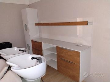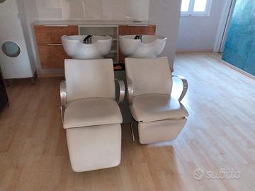 vendesi arredamento completo maletti composto da due bellissimi lavaggi più bellissimo mobile retro lavaggio più quattro posizioni di lavoro compresi di poltrone specchiare con luci a led più reception silver style con luci a led più divano attesa tre posti più sgabello più casco asciugacapelli + 2 lampade soffitto stile industriale più due mobiletti portaoggetti della collezione più due scaldabagno da 90 litri l'uno.